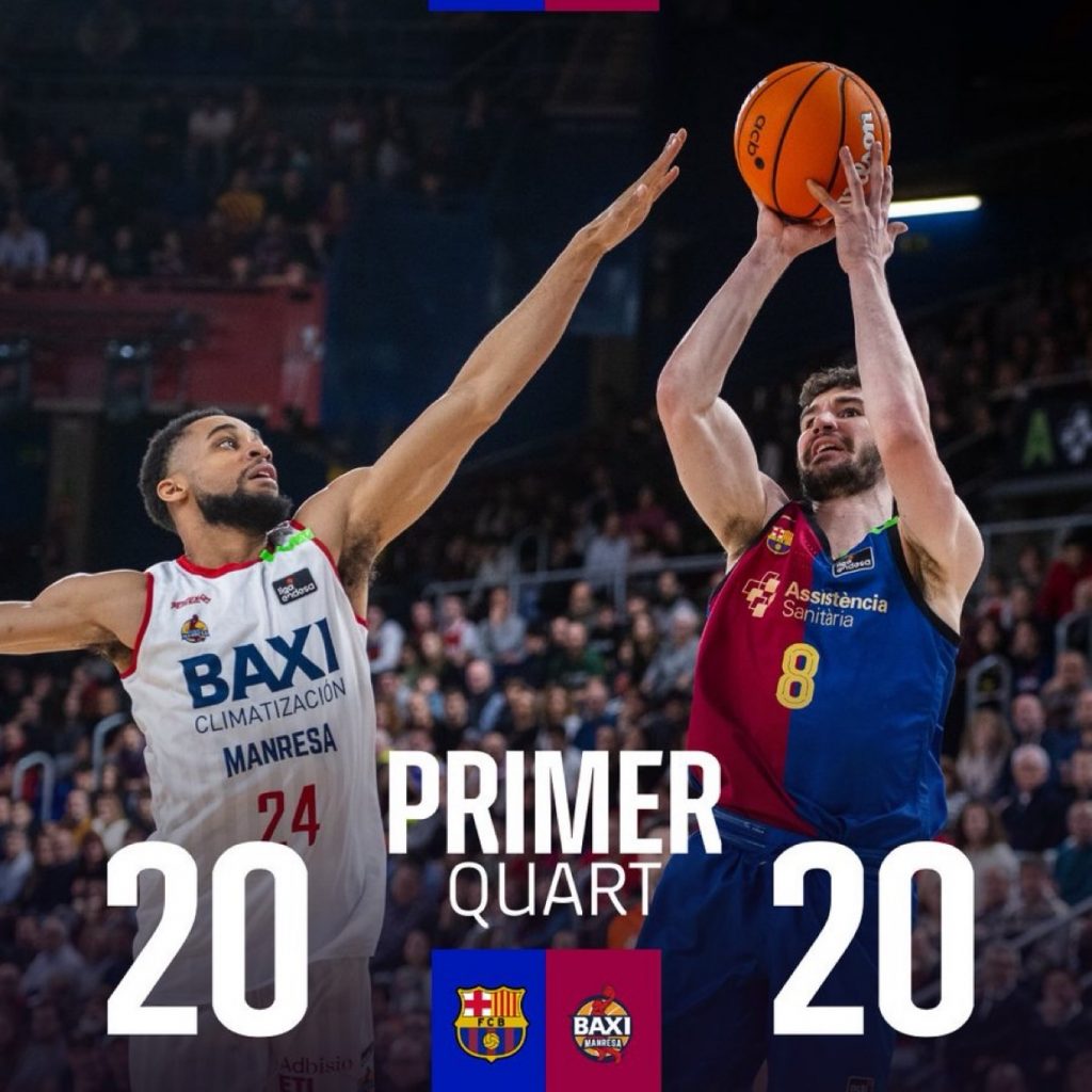 El partido ha empezado lento ya que los equipos desde el principio apretaban en sus defensa, el resultado era el siguiente 13-8, el Manresa ha obligado a pedir tiempo muerto al Barcelona, ya que el resultado era el siguiente: 16-15 antes de acabar el primer cuarto, el Manresa ha hecho a su favor un 0-7. Final del primer cuarto 20-20