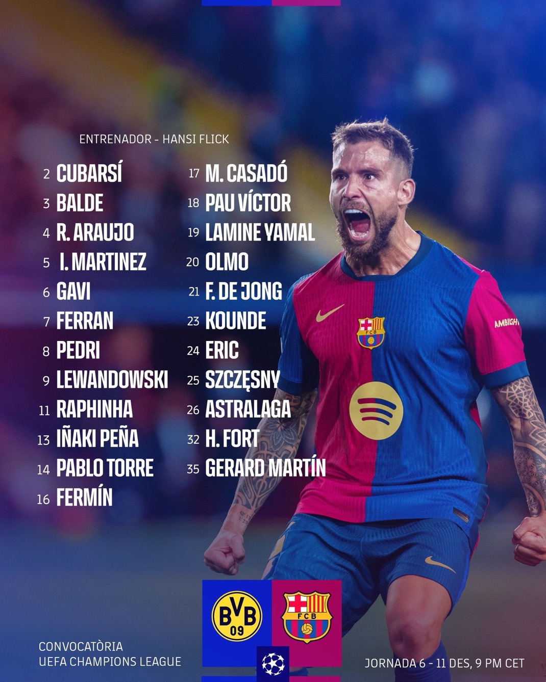 El Barça ya ha hecho pública la convocatoria del FCBarcelona para el Borussia Dortmund v Barça de mañana en el Signal Idunal Park de Jornada 6 de la UEFA Champions League