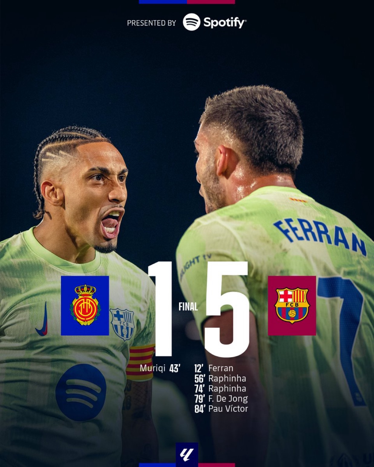 Los goles ha sido de Raphinha x2, Ferrán, De Jong y Pau Victor por parte de los cueles y de Muriqi por parte de los Bermellones