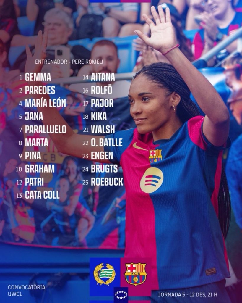 Tras una larga espera, porfín reaparece Salma Paralluelo en una convocatoria del FCBarcelona Femení, que a la vez también está acompañada de Kika Nazareth, que ha recibido el alta médica y también estará en el partido de mañana de la Jornada 5 de la UEFA Women’s Champions League contra el Hammarby